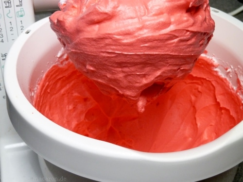 Gib nach 5 Minuten noch etwas rote Lebensmittelfarbe dazu und färbe die Meringue durch.