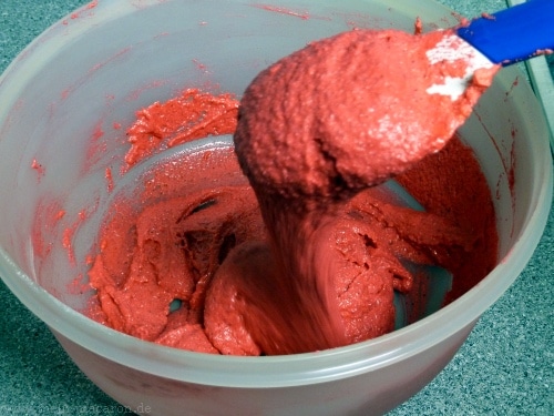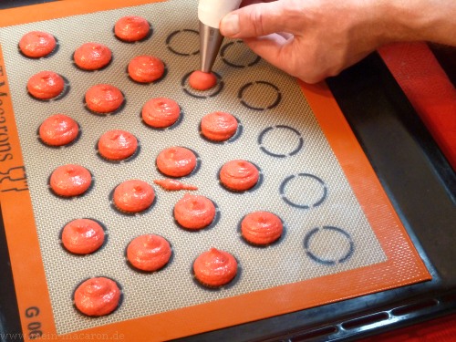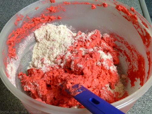 Ich habe dafür einen Teig aus französischer Meringue hergestellt und mit roter Lebensmittelfarbe eingefärbt, Grundrezept für Macarons aus franz. Meringue.
