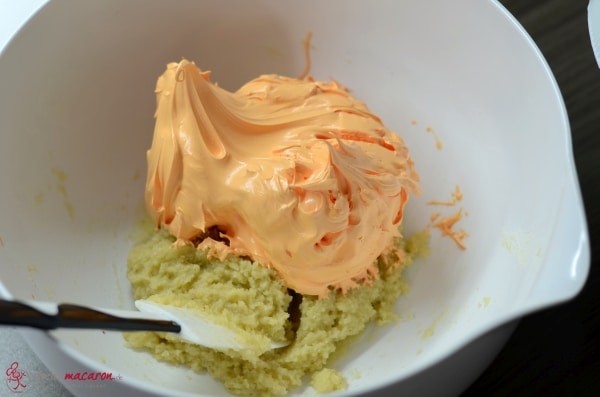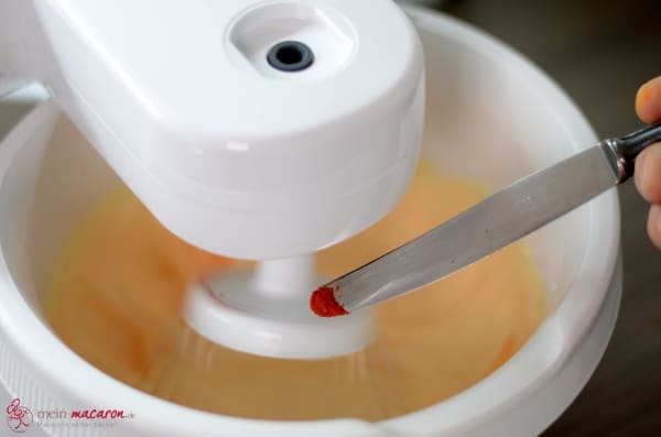 Entsprechend der Füllung müsstest du nur noch eine passende Farbe für den Macaronteig (genannt „Macaronage“) auswählen und ihn einfärben.