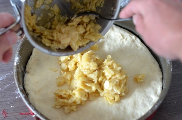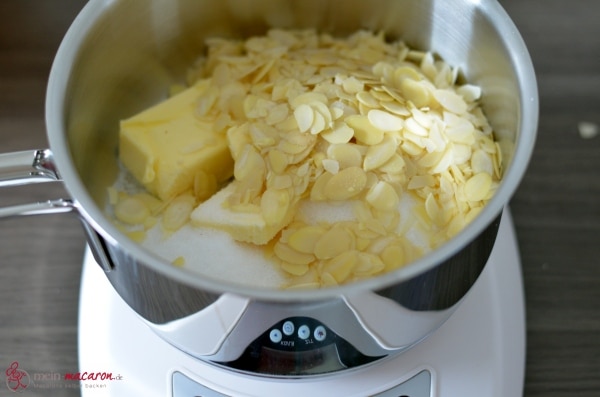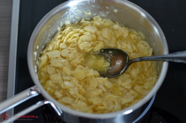 Jetzt kommt der Mandelbelag oben drauf. |  |