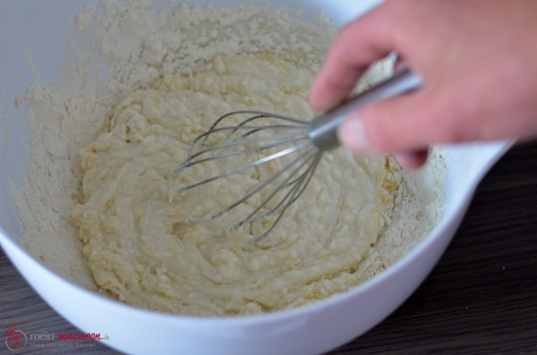 Gib die Hälfte vom Mehl dazu und rühre es mit einem Schneebesen unter, bis du einen zähen Teig hast. |  |