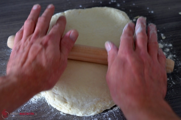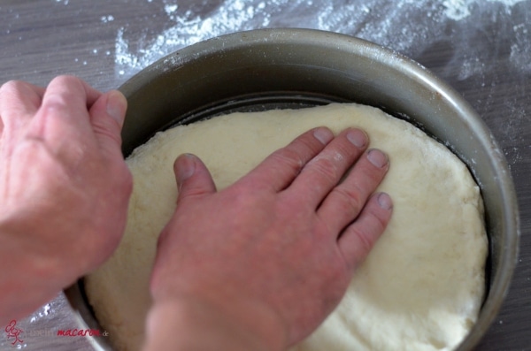 ... und rolle ihn, mit etwas Mehl, auf etwa die Größe der Springform (Ø 26 cm) aus. |  |