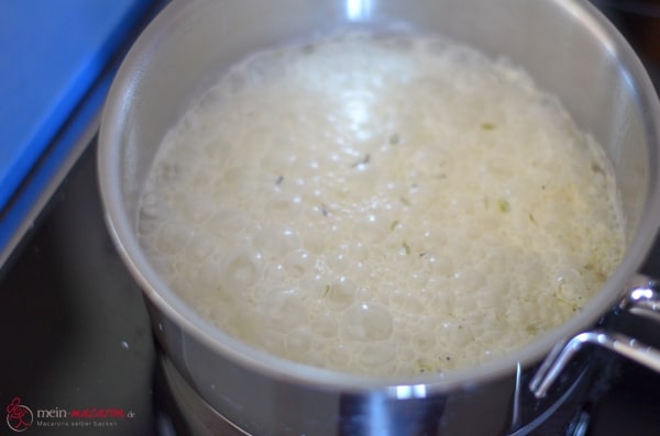 Erwärme die Sahne mit dem Lavendel nochmals und gib sie zur aufgelösten Kuvertüre.
