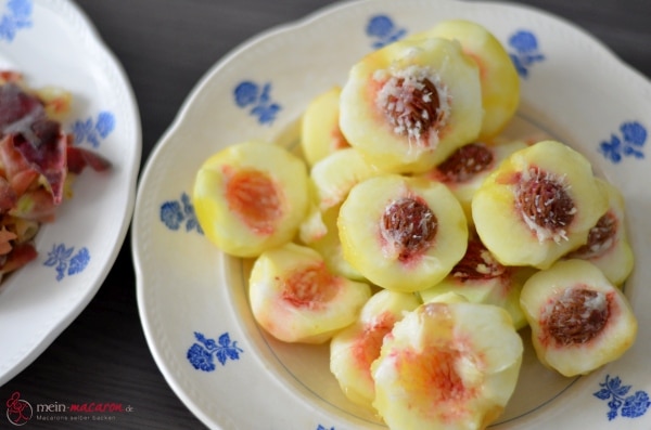 Eine cremige Füllung aus Pfirsich für Macarons und Torten, abgebunden mit Ei, Butter und weißer Kuvertüre. Ähnlich eines Lemon Curd.