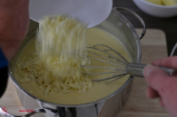 Nimm den Topf vom Herd und gib sofort die gehackte Kuvertüre dazu.