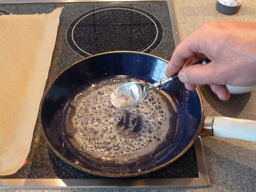 Sei bitte sehr  vorsichtig wenn Du Zucker karamellisierst. Der flüssige Zucker ist sehr heiß!!!
