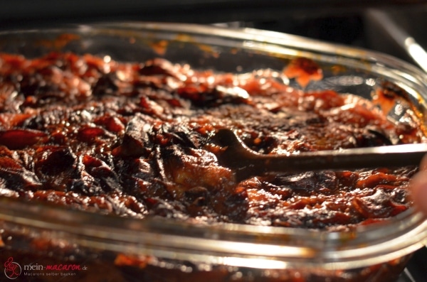 Nach nun etwas mehr wie 4 Stunden haben sich die Zwetschgen/Pflaumen fast vollständig aufgelöst und die Auflaufform kann aus dem Backofen genommen werden. |  |