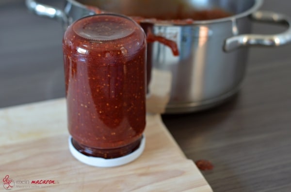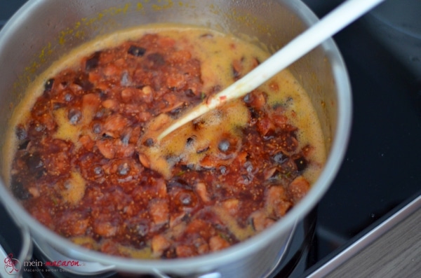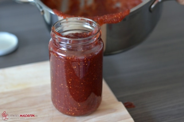 Dazu gebe ich die Feigenmarmelade, wie den Macaronteig, in einen Spritzbeutel mit einer Lochtülle.